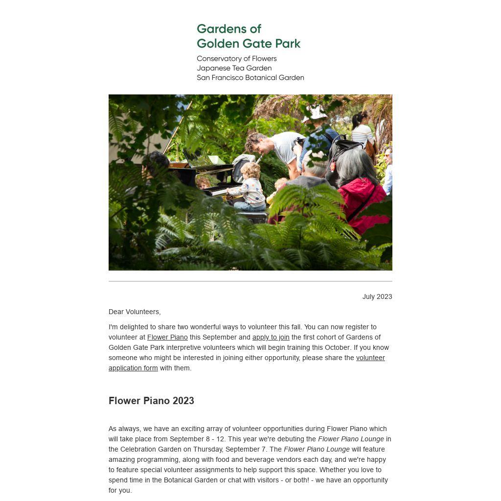 I'm delighted to share two wonderful ways to volunteer this fall. You can now register to volunteer at Flower Piano this September and apply to join the first cohort of Gardens of Golden Gate Park interpretive volunteers which will begin training this October. If you know someone who might be interested in joining either opportunity, please share the volunteer application form with them.