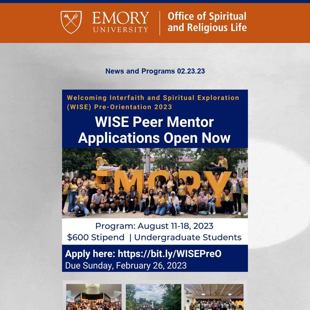 Emory OSRL ENews is published weekly during the term by the Emory University Office of Spiritual and Religious Life publicizing Atlanta-campus spiritual life programs. It is not a comprehensive listing. For Oxford College spiritual life, please click here. To submit information or to update your preferences, please contact religiouslife@emory.edu.