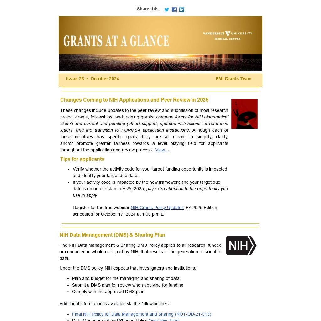 Register for the free webinar NIH Grants Policy Updates: FY 2025 Edition, scheduled for October 17, 2024 at 1:00 p.m ET