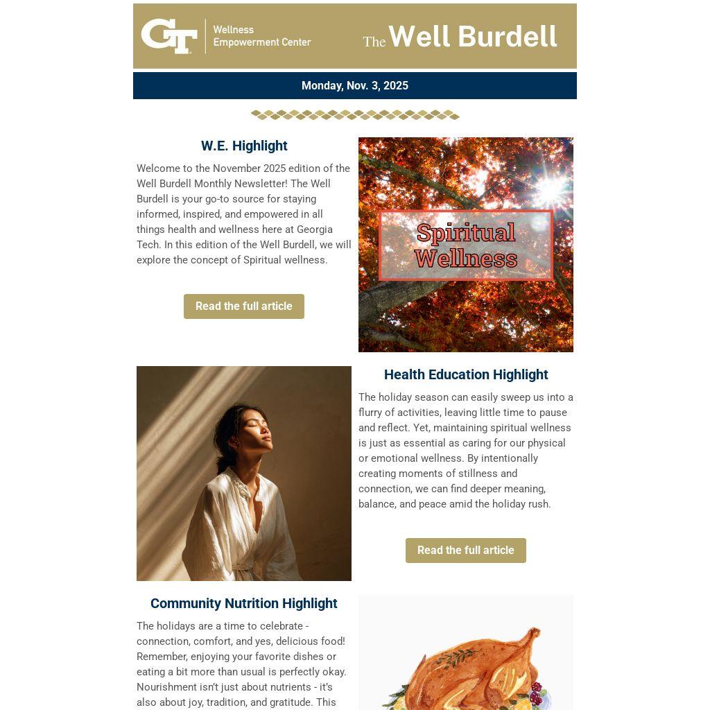 Welcome to the November 2025 edition of the Well Burdell Monthly Newsletter! The Well Burdell is your go-to source for staying informed, inspired, and empowered in all things health and wellness here at Georgia Tech. In this edition of the Well Burdell, we will explore the concept of Spiritual wellness.