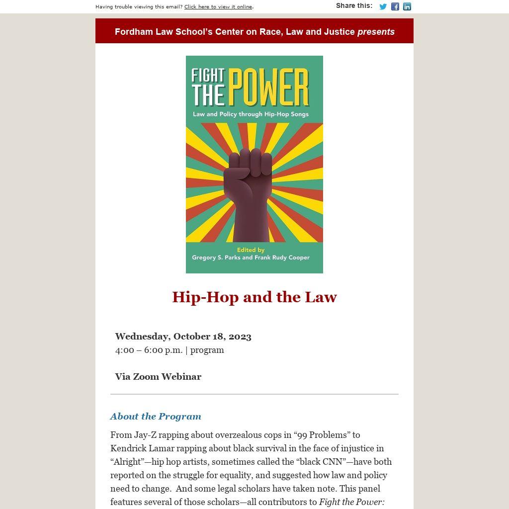 From Jay-Z rapping about overzealous cops in “99 Problems” to Kendrick Lamar rapping about black survival in the face of injustice in “Alright”—hip hop artists, sometimes called the “black CNN”—have both reported on the struggle for equality, and suggested how law and policy need to change. And some legal scholars have taken note. This panel features several of those scholars—all contributors to Fight the Power: Law and Policy Through Hip-Hop Songs—who will show that hip-hop has a lot to say about the law, and that more of us should listen.