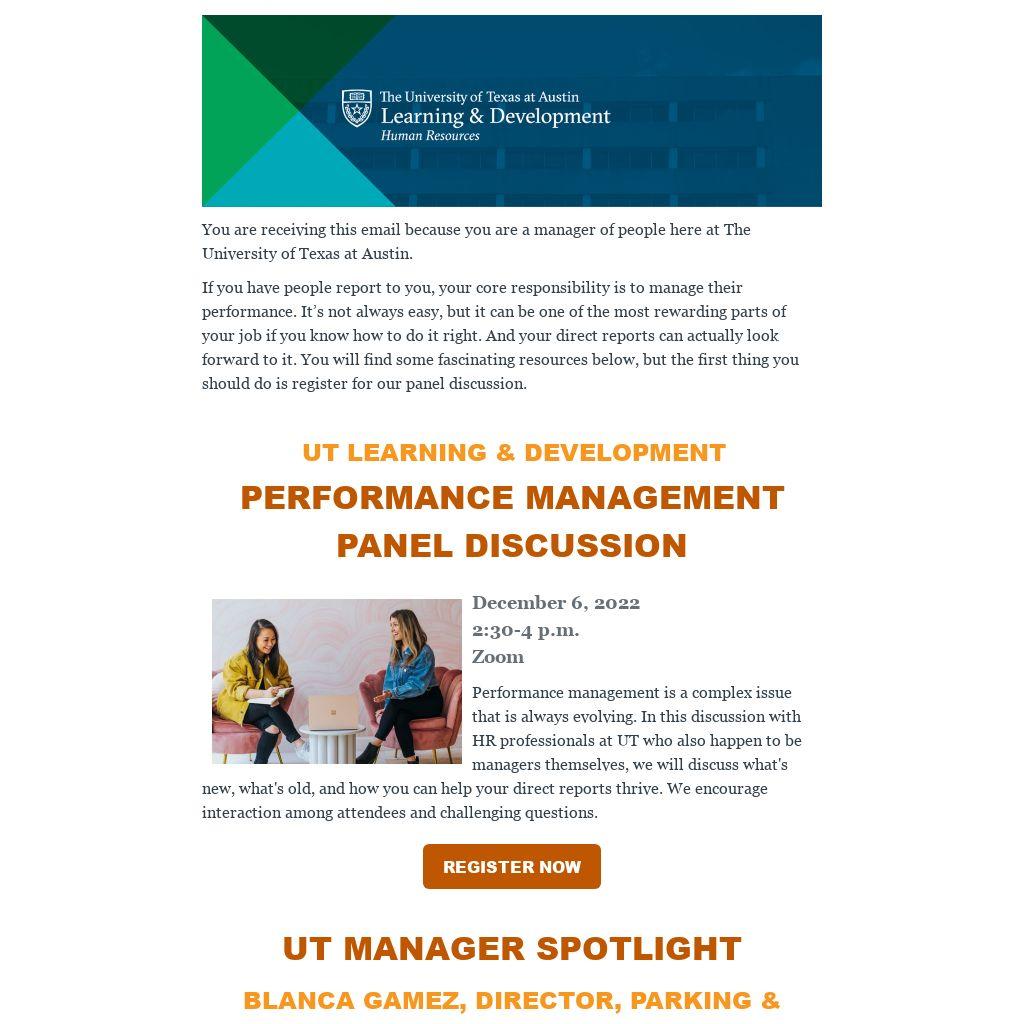 Performance management is a complex issue that is always evolving. In this discussion with HR professionals at UT who also happen to be managers themselves, we will discuss what's new, what's old, and how you can help your direct reports thrive. We encourage interaction among attendees and challenging questions.