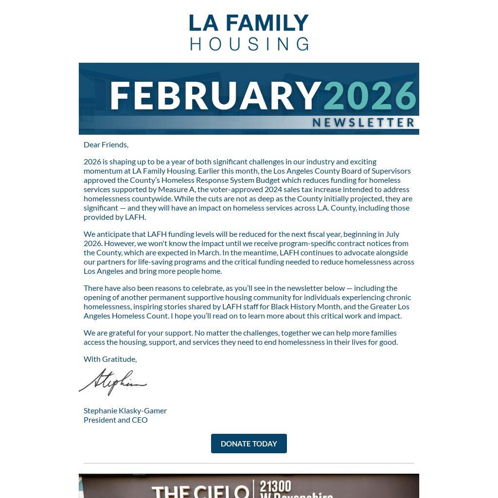 We anticipate that LAFH funding levels will be reduced for the next fiscal year, beginning in July 2026. However, we won't know the impact until we receive program-specific contract notices from the County, which are expected in March. In the meantime, LAFH continues to advocate alongside our partners for life-saving programs and the critical funding needed to reduce homelessness across Los Angeles and bring more people home.