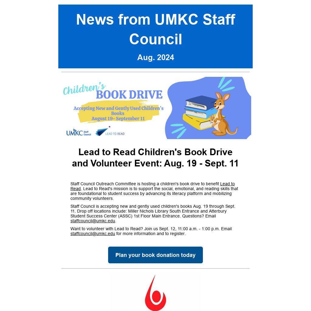 Staff Council is accepting new and gently used children's books Aug. 19 through Sept. 11. Drop off locations include: Miller Nichols Library South Entrance and Atterbury Student Success Center (ASSC) 1st Floor Main Entrance. Questions? Email staffcouncil@umkc.edu.