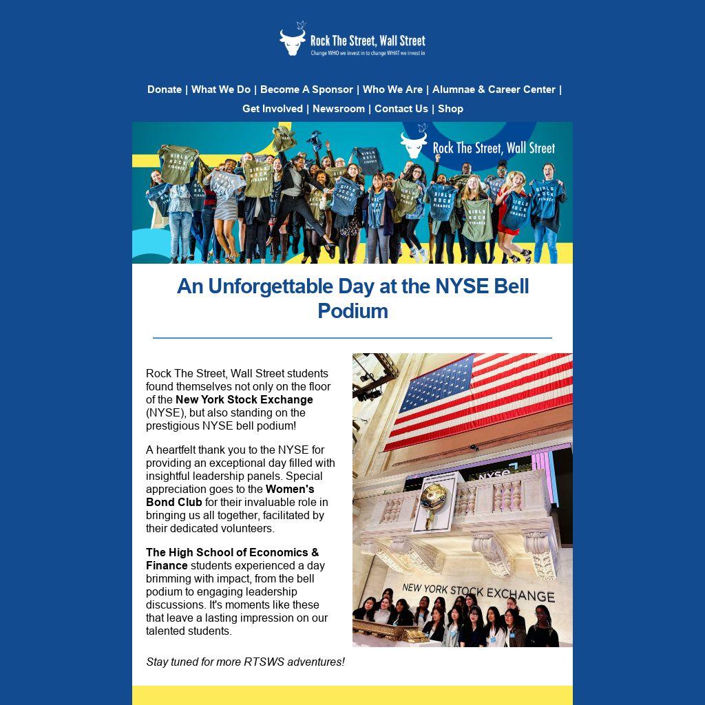 Rock The Street, Wall Street students found themselves not only on the floor of the New York Stock Exchange (NYSE), but also standing on the prestigious NYSE bell podium!