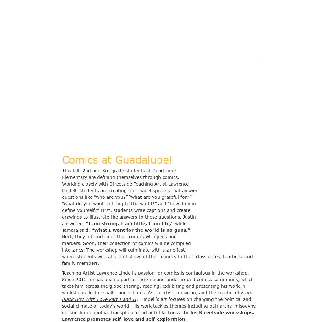 This fall, 2nd and 3rd grade students at Guadalupe Elementary are defining themselves through comics. Working closely with Streetside Teaching Artist Lawrence Lindell, students are creating four-panel spreads that answer questions like “who are you?” “what are you grateful for?” “what do you want to bring to the world?” and “how do you define yourself?” First, students write captions and create drawings to illustrate the answers to these questions. Justin answered, “I am strong, I am little, I am life,” while Tamara said, “What I want for the world is no guns.” Next, they ink and color their comics with pens and markers. Soon, their collection of comics will be compiled into zines. The workshop will culminate with a zine fest, where students will table and show off their comics to their classmates, teachers, and family members. Teaching Artist Lawrence Lindell’s passion for comics is contagious in the workshop. Since 2012 he has been a part of the zine and underground comics community, which takes him across the globe sharing, reading, exhibiting and presenting his work in workshops, lecture halls, and schools. As an artist, musician, and the creator of From Black Boy With Love Part I and II, Lindell’s art focuses on changing the political and social climate of today’s world. His work tackles themes including patriarchy, misogyny, racism, homophobia, transphobia and anti-blackness. In his Streetside workshops, Lawrence promotes self-love and self-exploration.