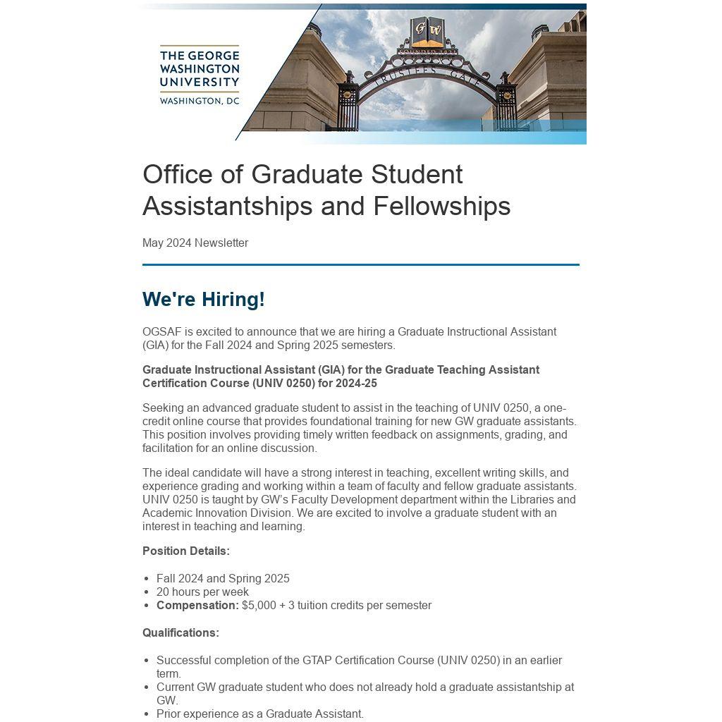 OGSAF is excited to announce that we are hiring a Graduate Instructional Assistant (GIA) for the Fall 2024 and Spring 2025 semesters.