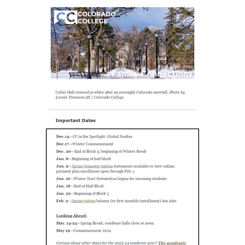 Help your student maximize their Winter Break! While winter break is a chance for students to relax and rejuvenate, it's also an ideal time for personal reflection, advice gathering, securing summer opportunities such as internships, and preparing for life beyond CC. Please encourage your student to join Career Center staff next Wednesday, Dec. 13, 1-2 p.m. (MT) for a workshop about strategies for making the most of their break with bite-sized tasks and activities. Students can RSVP on Handshake, available to them through CC's single sign-on page. Additionally, here are a few suggested conversation starters you can use to help your student feel supported during the break: