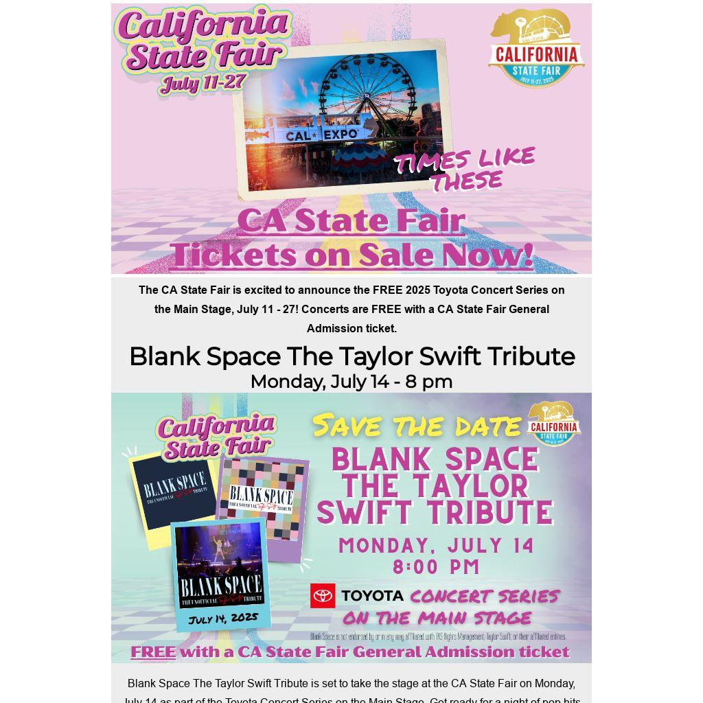 Blank Space The Taylor Swift Tribute is set to take the stage at the CA State Fair on Monday, July 14 as part of the Toyota Concert Series on the Main Stage. Get ready for a night of pop hits and sing-along anthems. The concert is free with general fair admission. Come experience this iconic show and make memories at the fair, running from July 11 to 27!