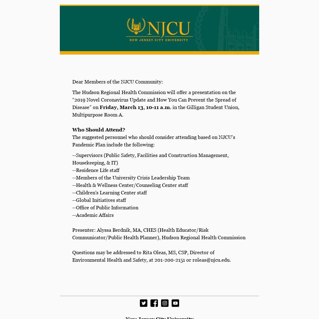 Questions may be addressed to Rita Oleas, MS, CSP, Director of Environmental Health and Safety, at 201-200-2151 or roleas@njcu.edu.