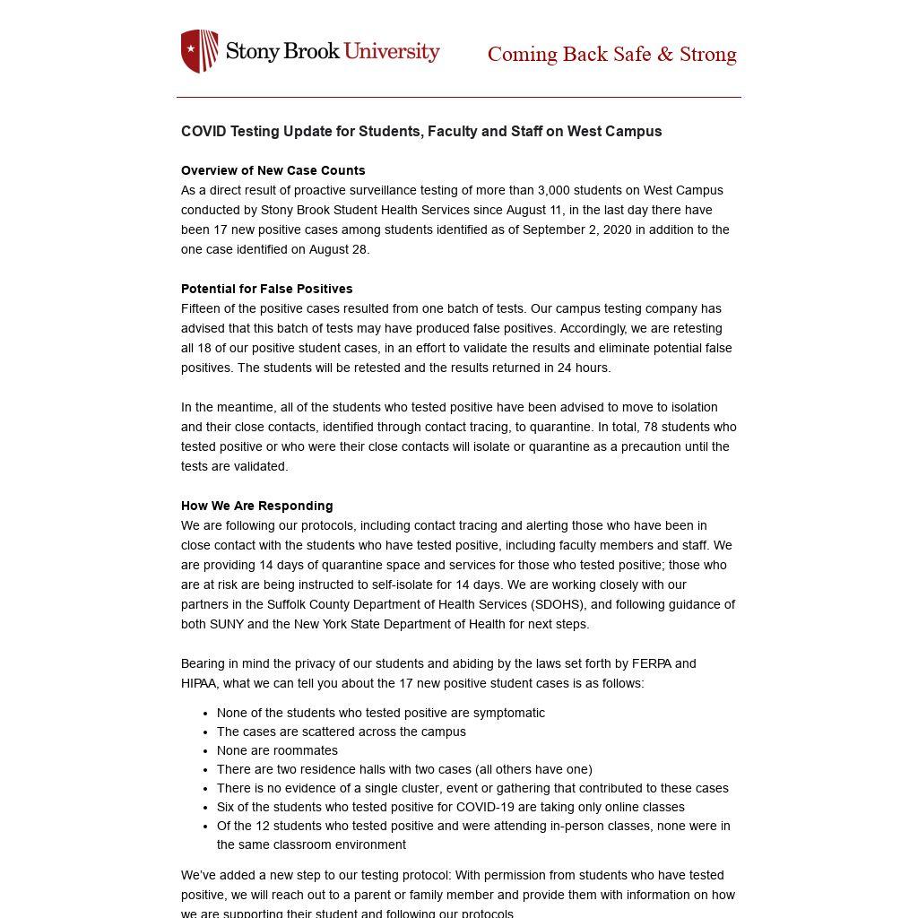 As a direct result of proactive surveillance testing of more than 3,000 students on West Campus conducted by Stony Brook Student Health Services since August 11, in the last day there have been 17 new positive cases among students identified as of September 2, 2020 in addition to the one case identified on August 28.