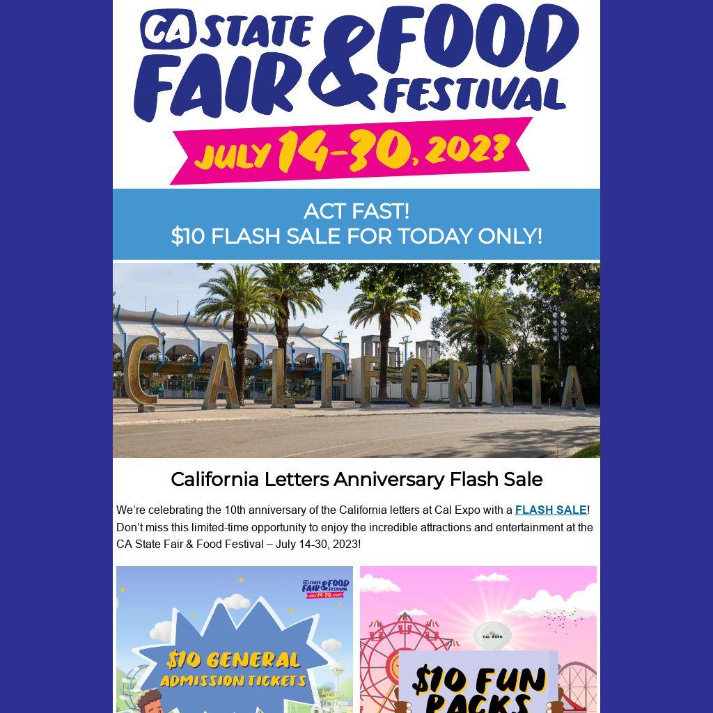 We’re celebrating the 10th anniversary of the California letters at Cal Expo with a FLASH SALE! Don’t miss this limited-time opportunity to enjoy the incredible attractions and entertainment at the CA State Fair & Food Festival – July 14-30, 2023!