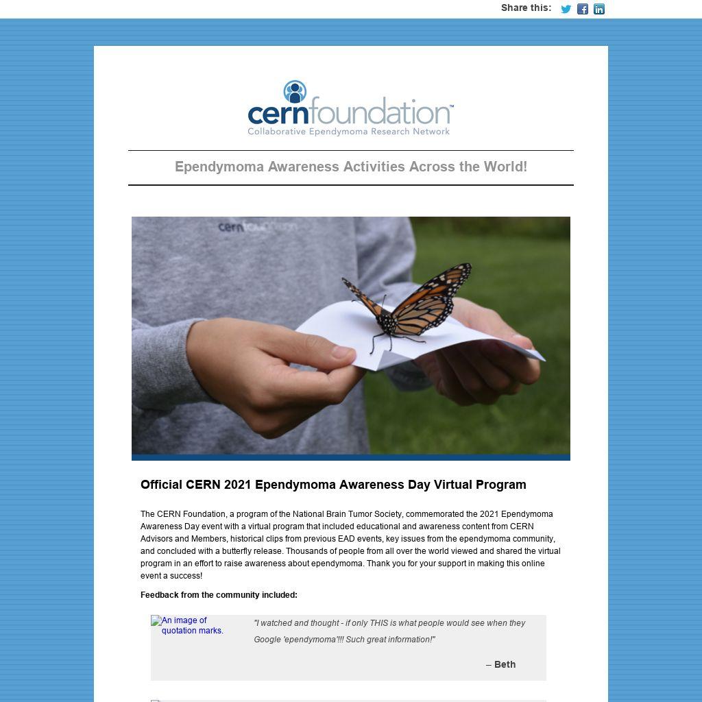 The CERN Foundation, a program of the National Brain Tumor Society, commemorated the 2021 Ependymoma Awareness Day event with a virtual program that included educational and awareness content from CERN Advisors and Members, historical clips from previous EAD events, key issues from the ependymoma community, and concluded with a butterfly release. Thousands of people from all over the world viewed and shared the virtual program in an effort to raise awareness about ependymoma. Thank you for your support in making this online event a success!