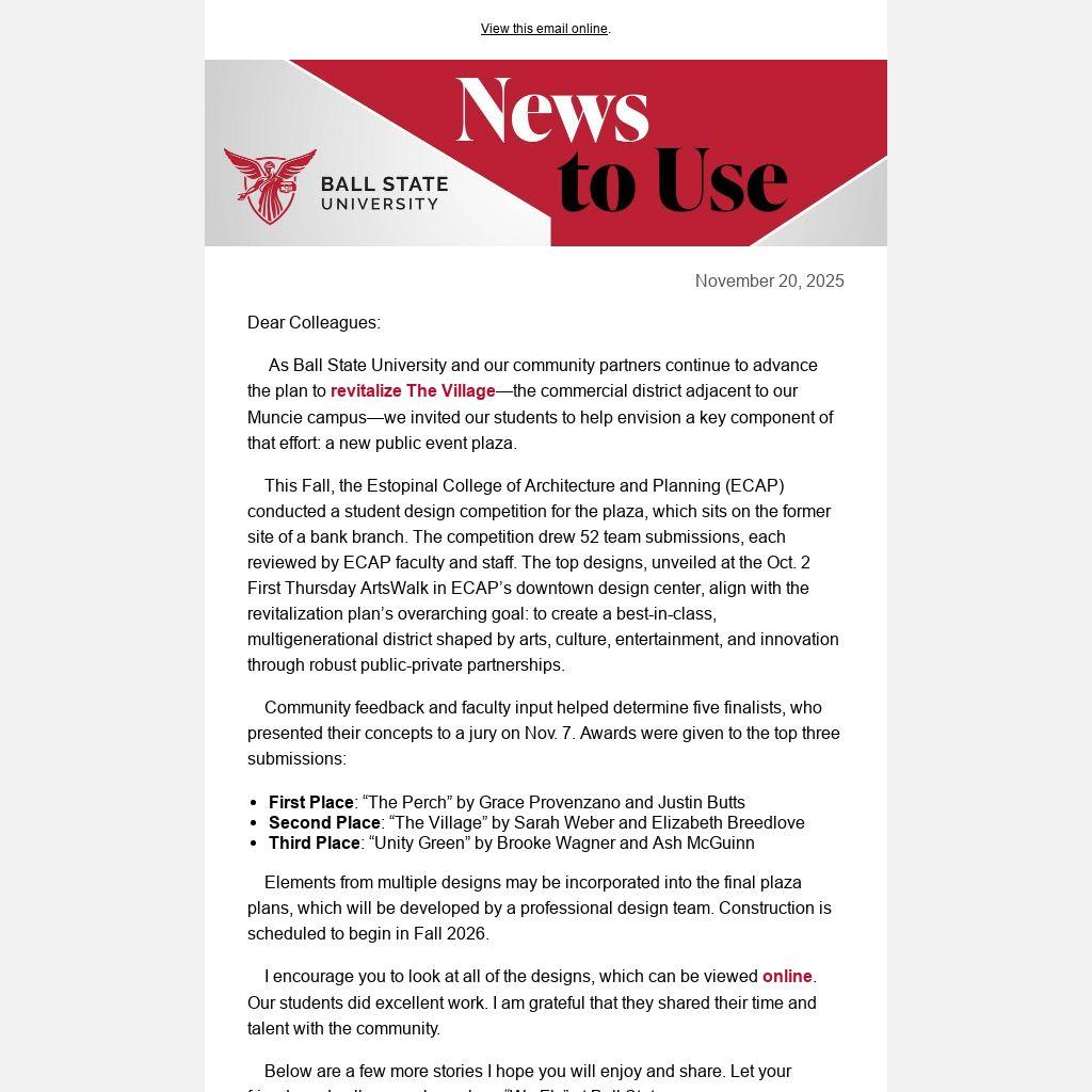 As Ball State University and our community partners continue to advance the plan to revitalize The Village—the commercial district adjacent to our Muncie campus—we invited our students to help envision a key component of that effort: a new public event plaza.