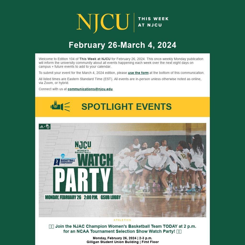 Welcome to Edition 104 of This Week at NJCUÂ for February 26, 2024. This once-weekly Monday publication will inform the university community about all events happening each week over the next eight days on campus + future events to add to your calendar.