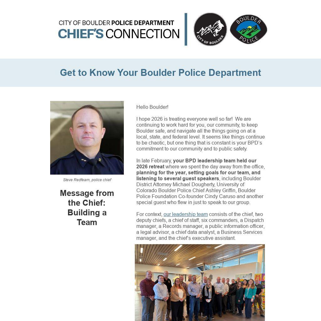 In late February, your BPD leadership team held our 2026 retreat where we spent the day away from the office, planning for the year, setting goals for our team, and listening to several guest speakers, including Boulder District Attorney Michael Dougherty, University of Colorado Boulder Police Chief Ashley Griffin, Boulder Police Foundation Co-founder Cindy Caruso and another special guest who flew in just to speak to our group.