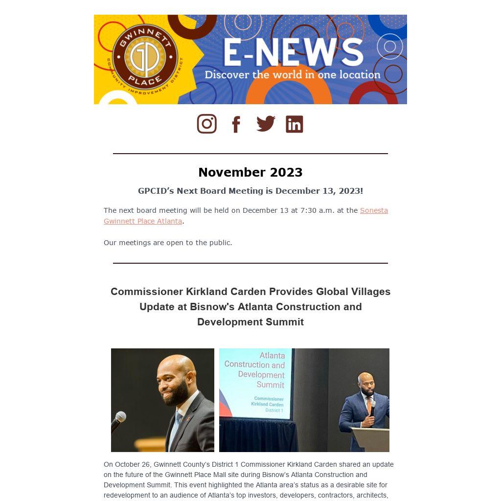 On October 26, Gwinnett County’s District 1 Commissioner Kirkland Carden shared an update on the future of the Gwinnett Place Mall site during Bisnow’s Atlanta Construction and Development Summit. This event highlighted the Atlanta area’s status as a desirable site for redevelopment to an audience of Atlanta’s top investors, developers, contractors, architects, government officials and community leaders.