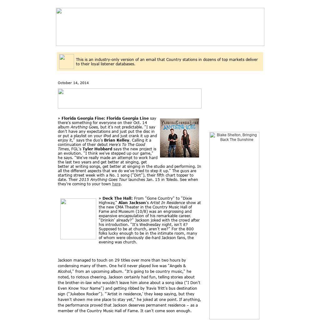 | This is an industry-only version of an email that Country stations in dozens of top markets deliver