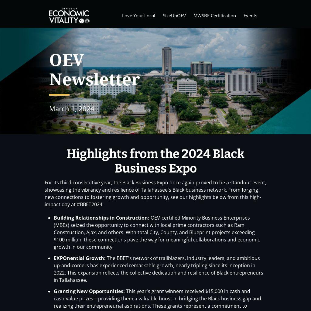 Delve into past issues of the OEV Newsletter to catch up on updates, insights, economic development initiatives, programs, and opportunities in Tallahassee-Leon County!
