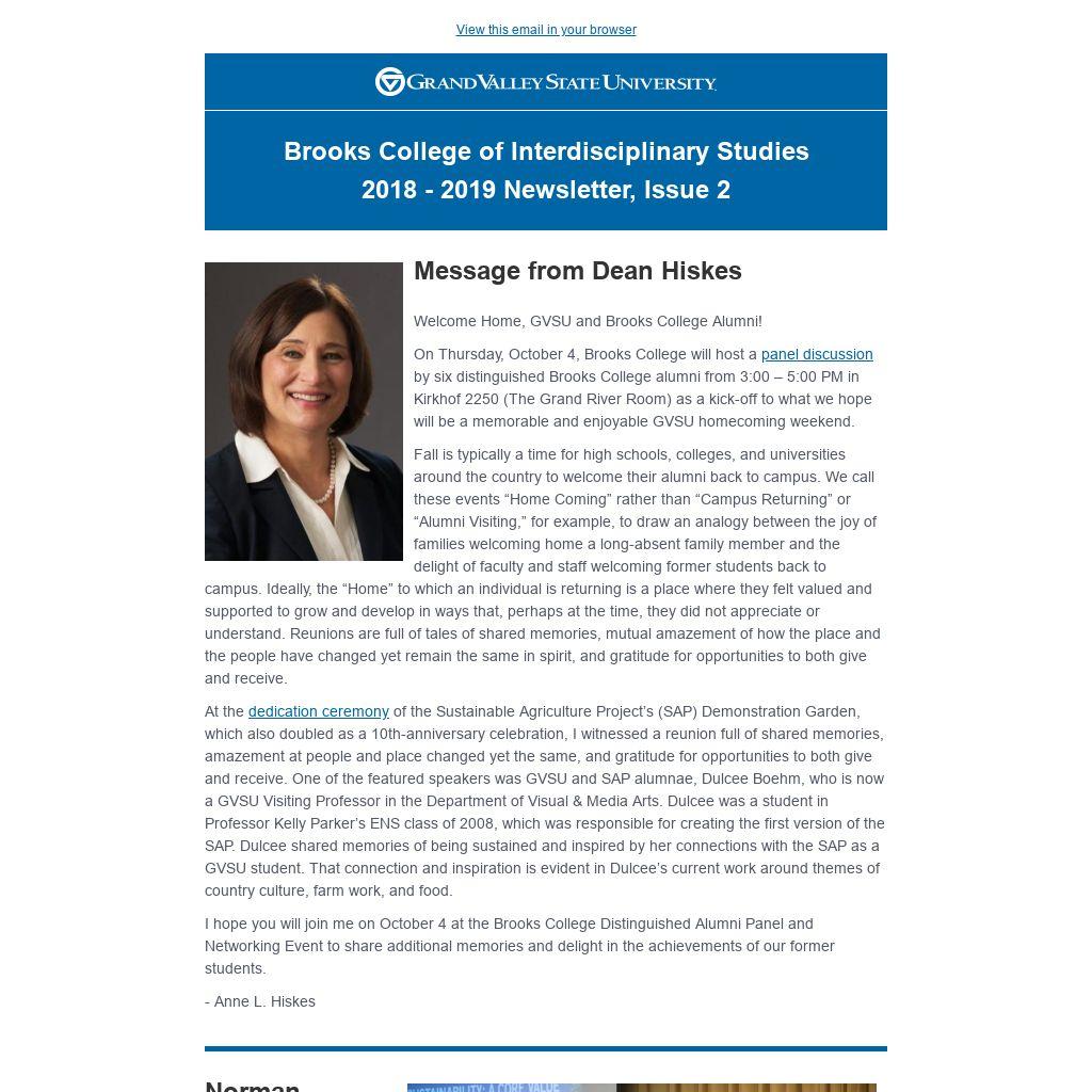 Message from Dean HiskesWelcome Home, GVSU and Brooks College Alumni! On Thursday, October 4, Brooks College will host a panel discussion by six distinguished Brooks College alumni from 3:00 – 5:00 PM in Kirkhof 2250 (The Grand River Room) as a kick-off to what we hope will be a memorable and enjoyable GVSU homecoming weekend. Fall is typically a time for high schools, colleges, and universities around the country to welcome their alumni back to campus. We call these events “Home Coming” rather than “Campus Returning” or “Alumni Visiting,” for example, to draw an analogy between the joy of families welcoming home a long-absent family member and the delight of faculty and staff welcoming former students back to campus. Ideally, the “Home” to which an individual is returning is a place where they felt valued and supported to grow and develop in ways that, perhaps at the time, they did not appreciate or understand. Reunions are full of tales of shared memories, mutual amazement of how the place and the people have changed yet remain the same in spirit, and gratitude for opportunities to both give and receive. At the dedication ceremony of the Sustainable Agriculture Project’s (SAP) Demonstration Garden, which also doubled as a 10th-anniversary celebration, I witnessed a reunion full of shared memories, amazement at people and place changed yet the same, and gratitude for opportunities to both give and receive. One of the featured speakers was GVSU and SAP alumnae, Dulcee Boehm, who is now a GVSU Visiting Professor in the Department of Visual & Media Arts. Dulcee was a student in Professor Kelly Parker’s ENS class of 2008, which was responsible for creating the first version of the SAP. Dulcee shared memories of being sustained and inspired by her connections with the SAP as a GVSU student. That connection and inspiration is evident in Dulcee’s current work around themes of country culture, farm work, and food. I hope you will join me on October 4 at the Brooks College Distinguished Alumni Panel and Networking Event to share additional memories and delight in the achievements of our former students. - Anne L. Hiskes