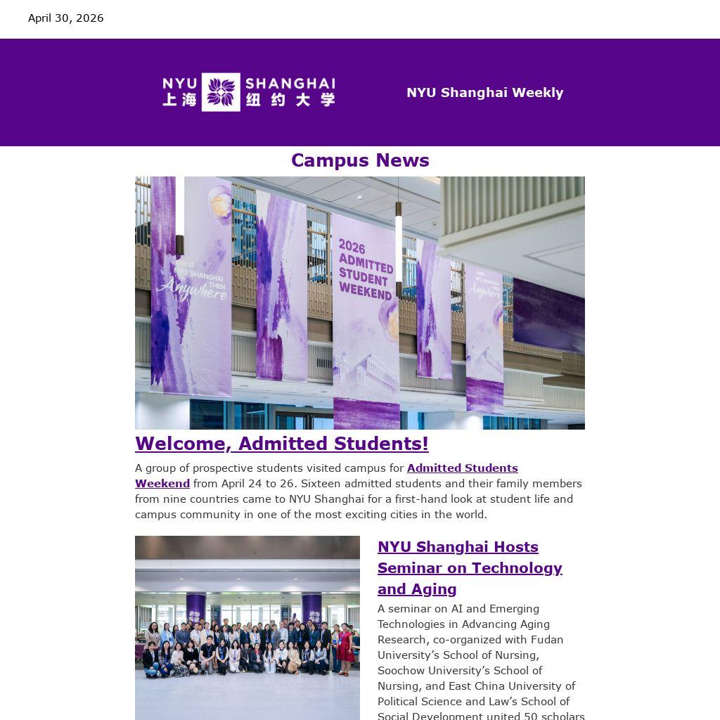For a complete listing of events at NYU Shanghai, check out the Weekly Events Newsletter, delivered to your inbox every Monday when school is in session. If you wish to highlight your event in the Weekly Events Newsletter, upload your event to Engage no later than the Thursday before the Monday newsletter.