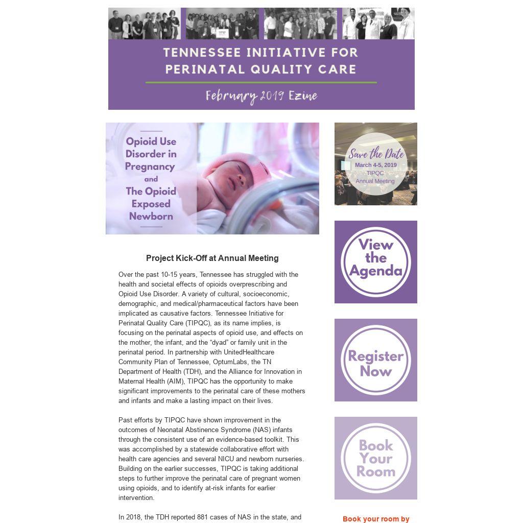 Over the past 10-15 years, Tennessee has struggled with the health and societal effects of opioids overprescribing and Opioid Use Disorder. A variety of cultural, socioeconomic, demographic, and medical/pharmaceutical factors have been implicated as causative factors. Tennessee Initiative for Perinatal Quality Care (TIPQC), as its name implies, is focusing on the perinatal aspects of opioid use, and effects on the mother, the infant, and the “dyad” or family unit in the perinatal period. In partnership with UnitedHealthcare Community Plan of Tennessee, OptumLabs, the TN Department of Health (TDH), and the Alliance for Innovation in Maternal Health (AIM), TIPQC has the opportunity to make significant improvements to the perinatal care of these mothers and infants and make a lasting impact on their lives.