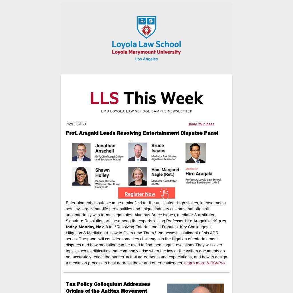 Event coordinators are encouraged to use the LLS Events Calendar for events they want promoted broadly. Note: You must select "Loyola Law School" in the department field in order for the event to display in the LLS roundup. Questions? Email us!