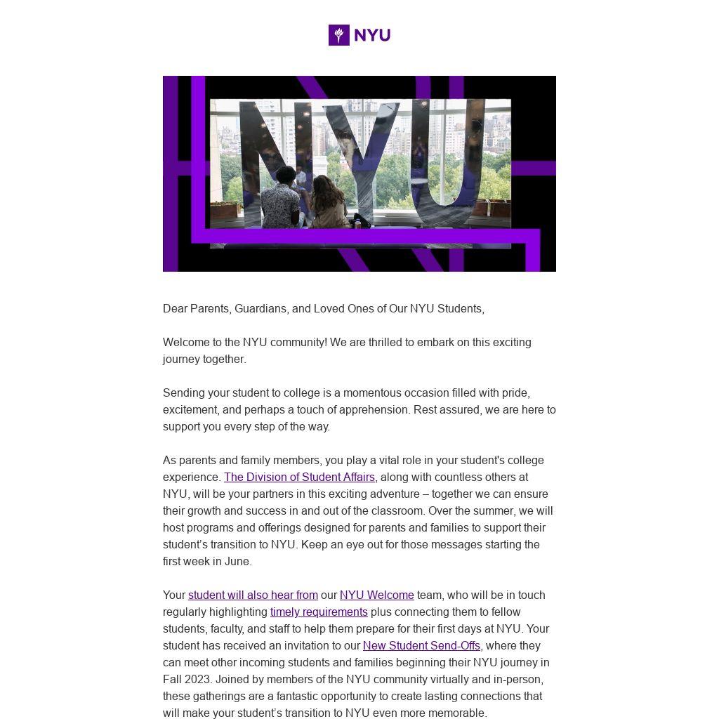 timely requirements plus connecting them to fellow students, faculty, and staff to help them prepare for their first days at NYU. Your student has received an invitation to our