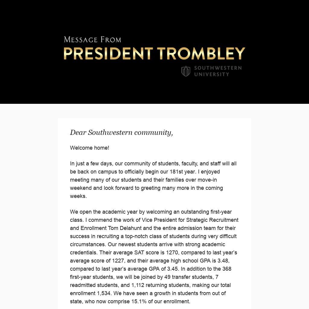 In the frenzy of the coming days, please remember to take a few moments to soak in the beauty of our campus and the fellowship of our community. There is nothing like Southwestern University, and collectively, you are the people who make it so very special.
