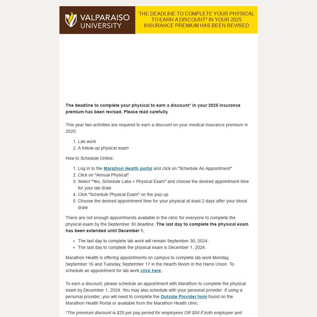 The deadline to complete your physical to earn a discount* in your 2025 insurance premium has been revised. Please read carefully.