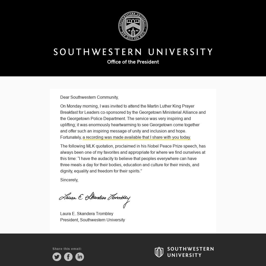 Dear Southwestern Community,