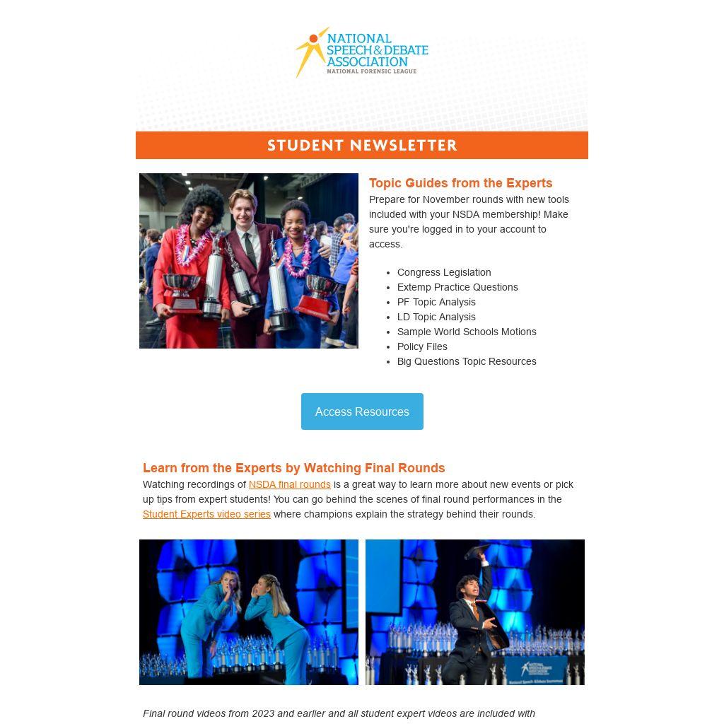 Watching recordings of NSDA final rounds is a great way to learn more about new events or pick up tips from expert students! You can go behind the scenes of final round performances in the Student Experts video series where champions explain the strategy behind their rounds.