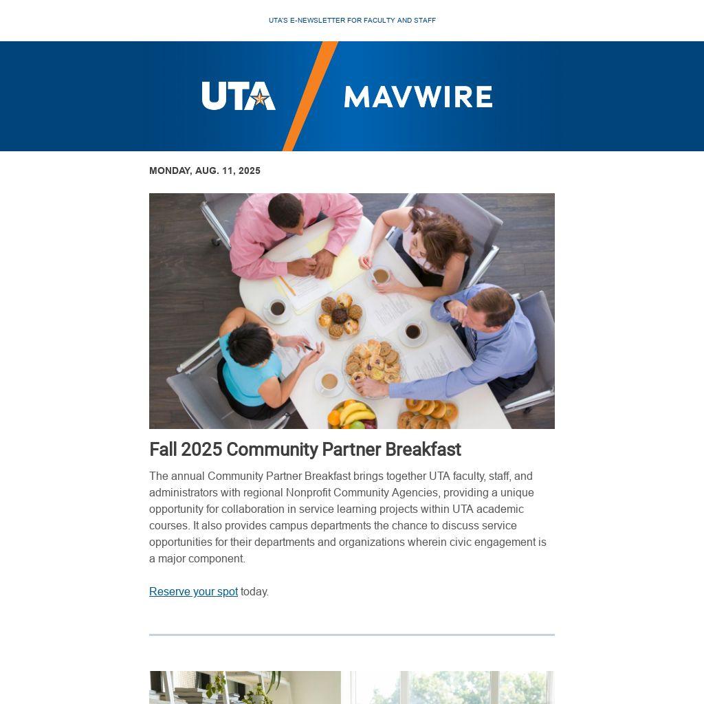 The annual Community Partner Breakfast brings together UTA faculty, staff, and administrators with regional Nonprofit Community Agencies, providing a unique opportunity for collaboration in service learning projects within UTA academic courses. It also provides campus departments the chance to discuss service opportunities for their departments and organizations wherein civic engagement is a major component.