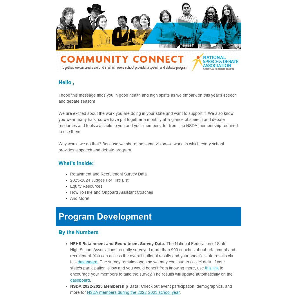 The Pay It Forward grant is available to start new programs and for under-resourced schools or schools experiencing hardship. This grant provides two years of a school membership, a free coach membership, and up to ten free student memberships. If you know of schools that should receive this grant in order to start or maintain a speech and debate program, please email membership@speechanddebate.org and mention the promo code "PIF-Community Connect."