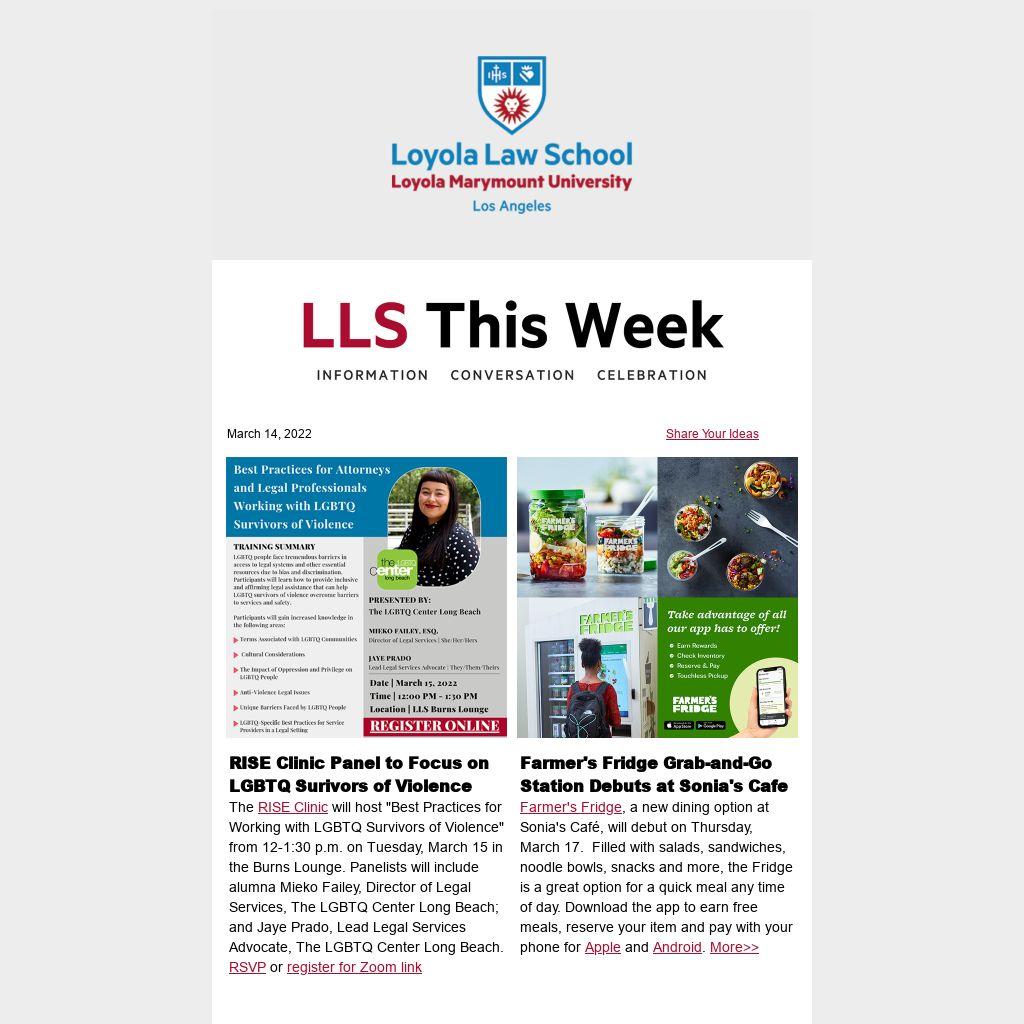 Event coordinators are encouraged to use the LLS Events Calendar for events they want promoted broadly. Note: You must select "Loyola Law School" in the department field in order for the event to display in the LLS roundup. Questions? Email us!