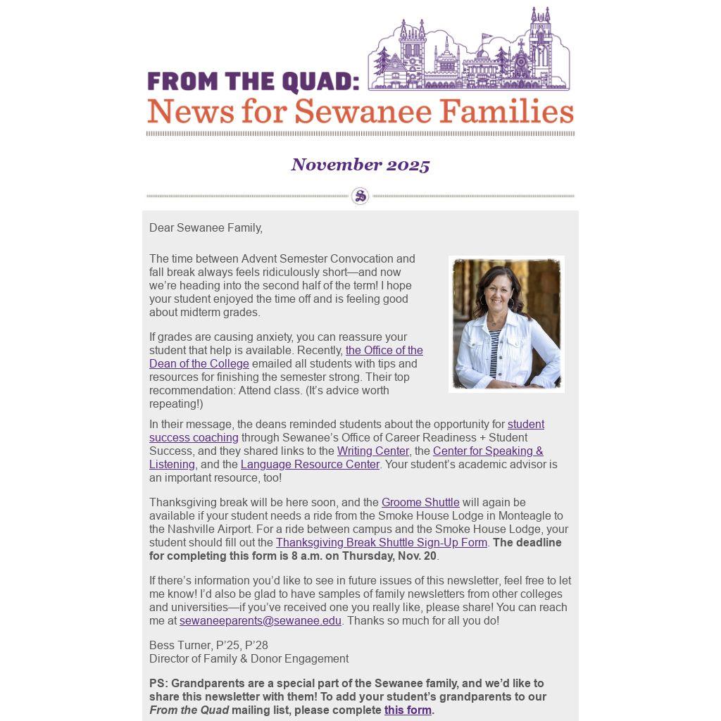 PS: Grandparents are a special part of the Sewanee family, and we’d like to share this newsletter with them! To add your student’s grandparents to our From the Quad mailing list, please complete this form.