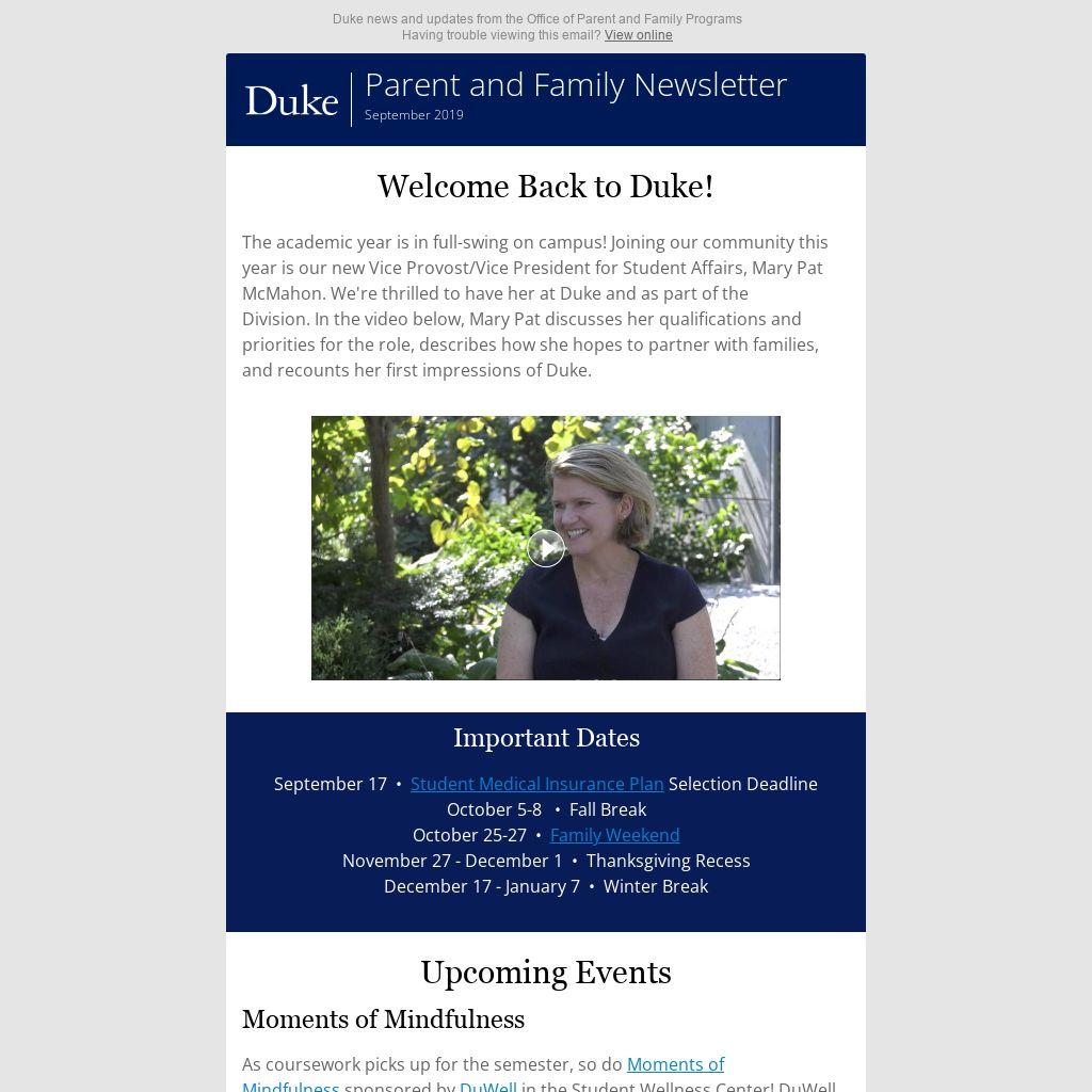 The academic year is in full-swing on campus! Joining our community this year is our new Vice Provost/Vice President for Student Affairs, Mary Pat McMahon. We're thrilled to have her at Duke and as part of the Division. In the video below, Mary Pat discusses her qualifications and priorities for the role, describes how she hopes to partner with families, and recounts her first impressions of Duke.