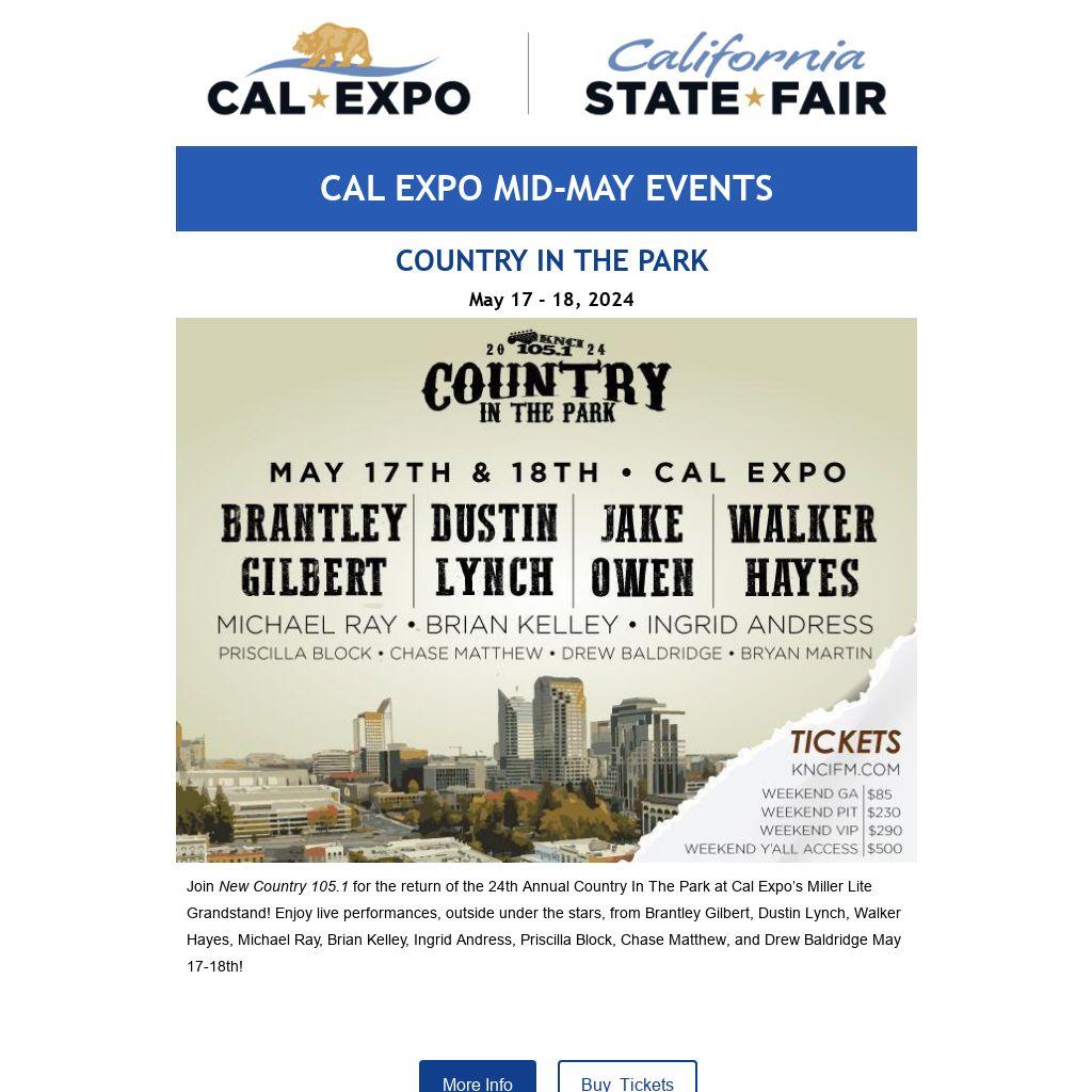 Join New Country 105.1 for the return of the 24th Annual Country In The Park at Cal Expo’s Miller Lite Grandstand! Enjoy live performances, outside under the stars, from Brantley Gilbert, Dustin Lynch, Walker Hayes, Michael Ray, Brian Kelley, Ingrid Andress, Priscilla Block, Chase Matthew, and Drew Baldridge May 17-18th!