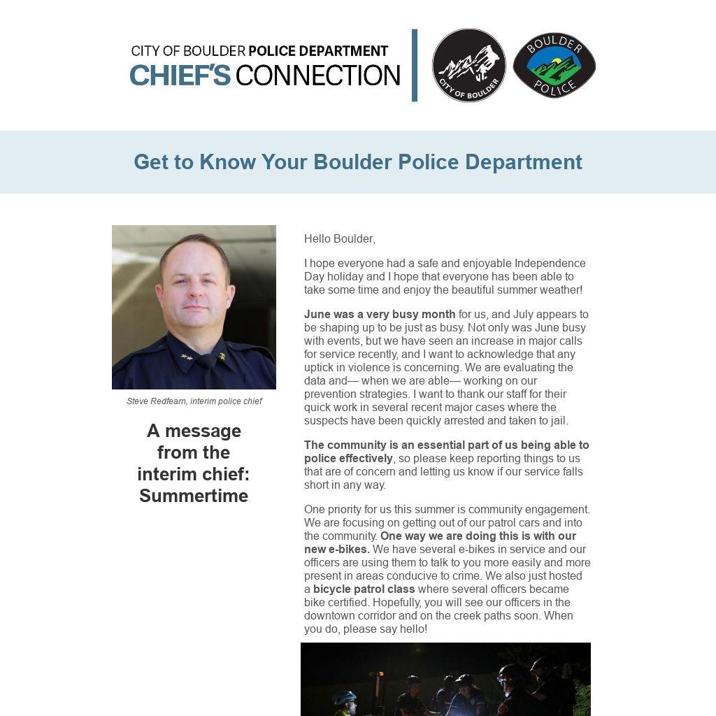 Speaking of community events, National Night Out will be here before we know it. This is a fun evening where we will be out in the community to meet all of you, bring our equipment and gear to show off, and answer your questions. This year, National Night Out will be on Tuesday, August 6th. From 5 to 8 p.m. at Foothills Community Park, at 800 Cherry Avenue. We’ll be joined by Fire-Rescue, Open Space and Mountain Parks and several other city departments. Follow our social media for more updates.
