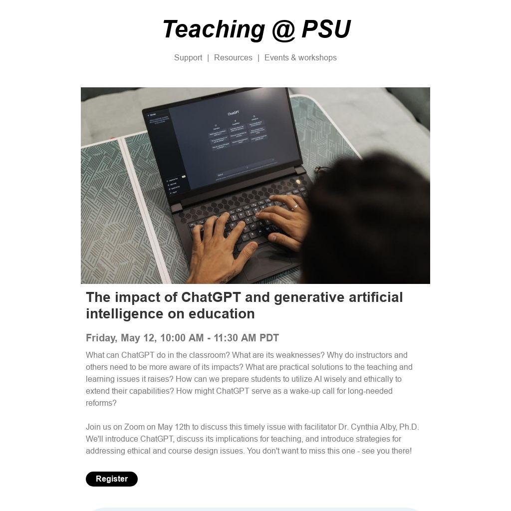 Join us on Zoom on May 12th to discuss this timely issue with facilitator Dr. Cynthia Alby, Ph.D. We'll introduce ChatGPT, discuss its implications for teaching, and introduce strategies for addressing ethical and course design issues. You don't want to miss this one - see you there!