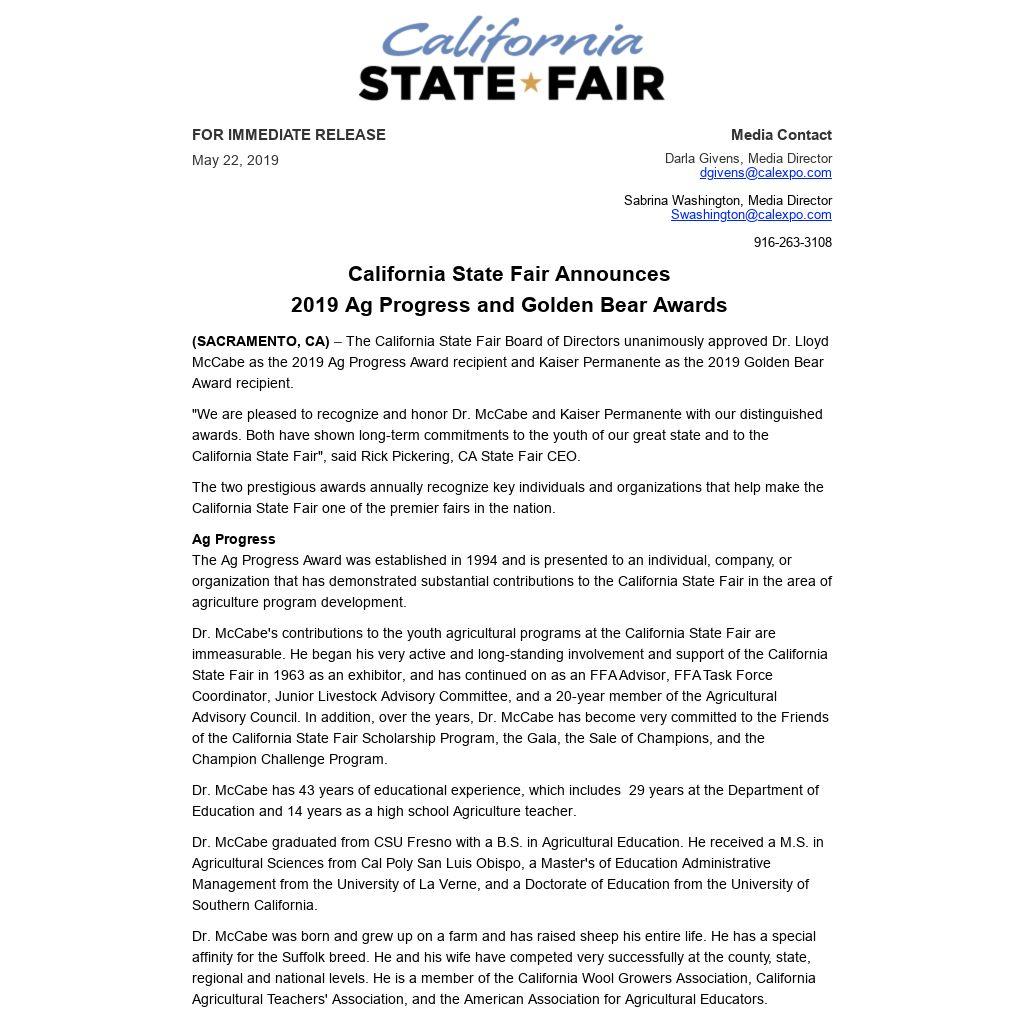 (SACRAMENTO, CA) – The California State Fair Board of Directors unanimously approved Dr. Lloyd McCabe as the 2019 Ag Progress Award recipient and Kaiser Permanente as the 2019 Golden Bear Award recipient.