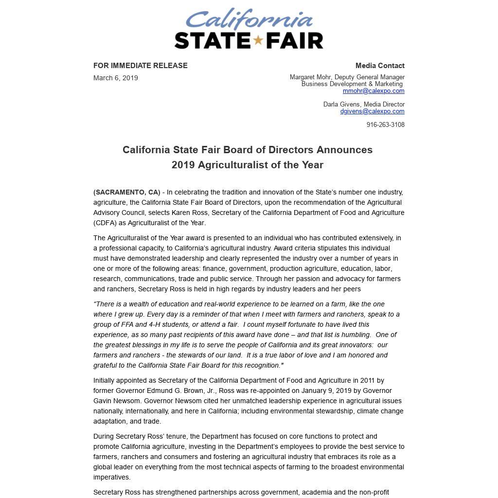 Secretary Ross will be publically recognized at the California Agriculture Day on the west steps of the State Capitol on Wednesday, March 20, 2019. She will formally be honored at the California State Fair Gala benefitting the youth scholarship programs of the Friends of the California State Fair on Thursday, June 27, 2019. Those interested in attending and honoring Secretary Ross can purchase tickets here.