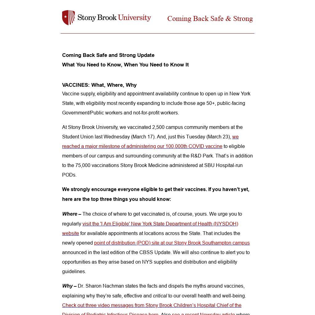 At Stony Brook University, we vaccinated 2,500 campus community members at the Student Union last Wednesday (March 17). And, just this Tuesday (March 23), we reached a major milestone of administering our 100,000th COVID vaccine to eligible members of our campus and surrounding community at the R&D Park. That’s in addition to the 75,000 vaccinations Stony Brook Medicine administered at SBU Hospital-run PODs.