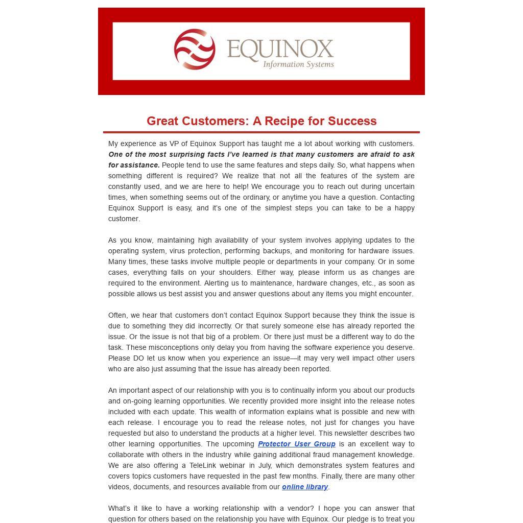My experience as VP of Equinox Support has taught me a lot about working with customers. One of the most surprising facts I’ve learned is that many customers are afraid to ask for assistance. People tend to use the same features and steps daily. So, what happens when something different is required? We realize that not all the features of the system are constantly used, and we are here to help! We encourage you to reach out during uncertain times, when something seems out of the ordinary, or anytime you have a question. Contacting Equinox Support is easy, and it’s one of the simplest steps you can take to be a happy customer.