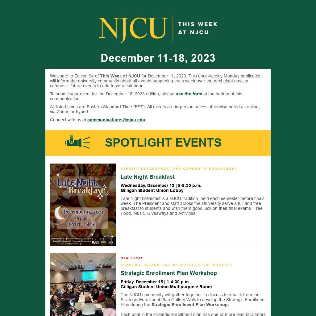 Welcome to Edition 94 of This Week at NJCU for December 11, 2023. This once-weekly Monday publication will inform the university community about all events happening each week over the next eight days on campus + future events to add to your calendar.