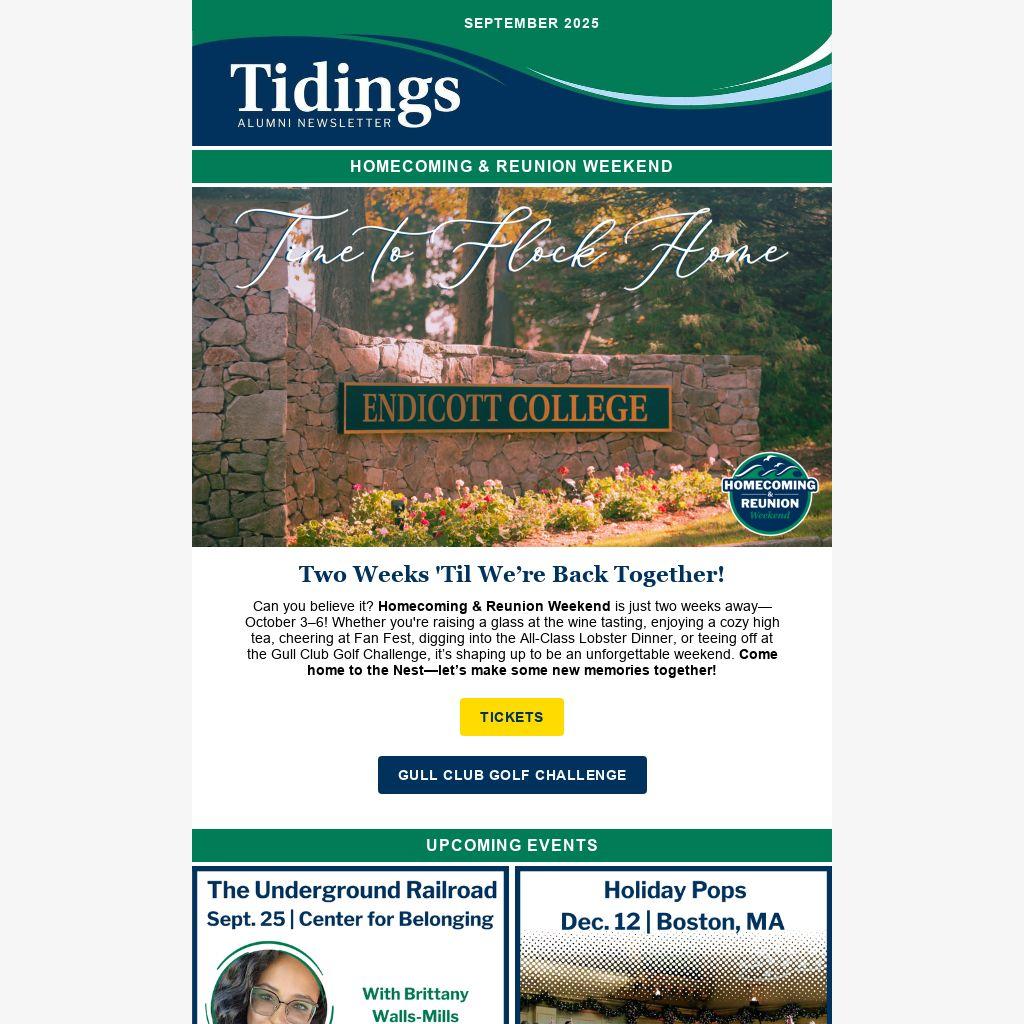 Can you believe it? Homecoming & Reunion Weekend is just two weeks away—October 3–6! Whether you're raising a glass at the wine tasting, enjoying a cozy high tea, cheering at Fan Fest, digging into the All-Class Lobster Dinner, or teeing off at the Gull Club Golf Challenge, it’s shaping up to be an unforgettable weekend. Come home to the Nest—let’s make some new memories together!