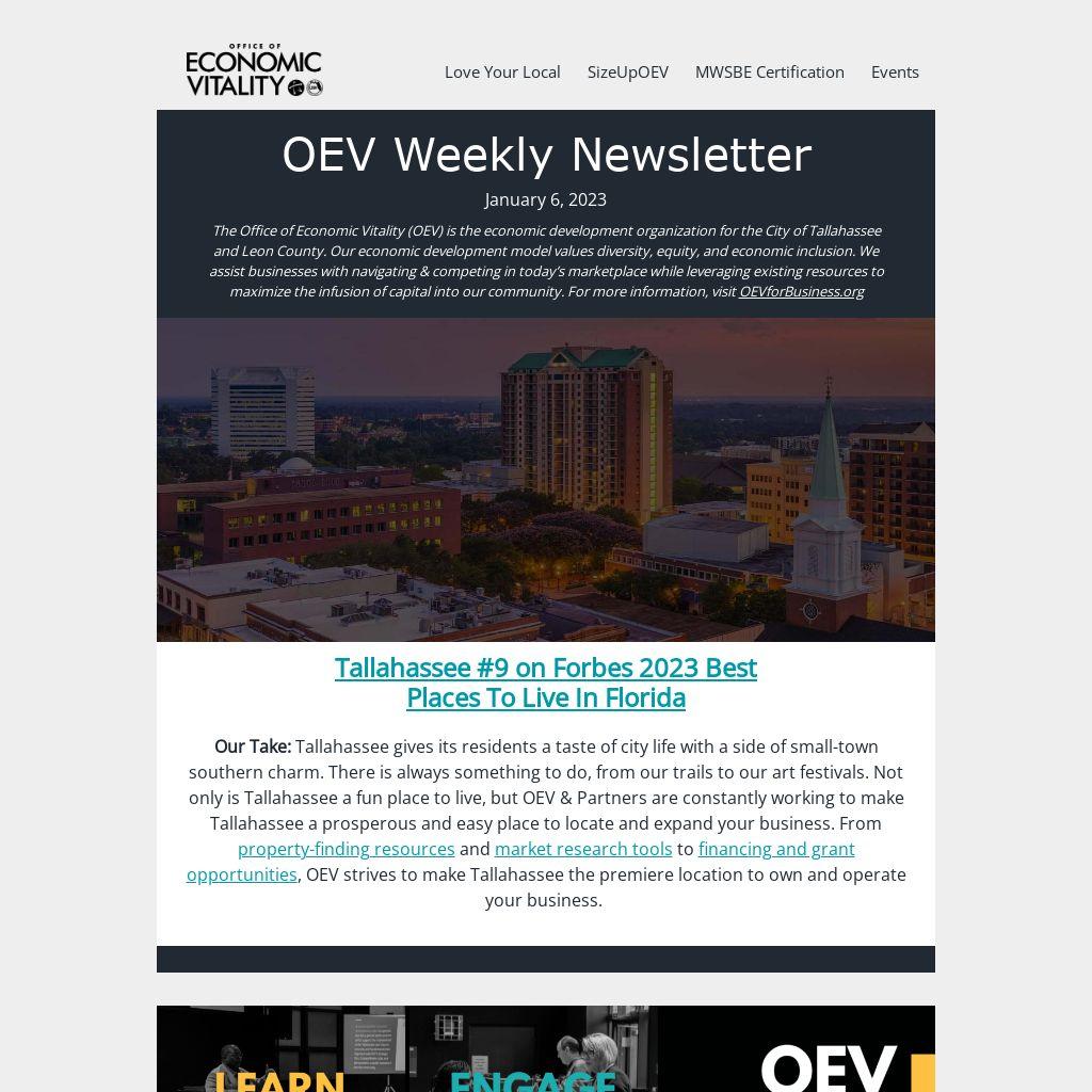 The Office of Economic Vitality (OEV) is the economic development organization for the City of Tallahassee and Leon County. Our economic development model values diversity, equity, and economic inclusion. We assist businesses with navigating & competing in today’s marketplace while leveraging existing resources to maximize the infusion of capital into our community. For more information, visit OEVforBusiness.org