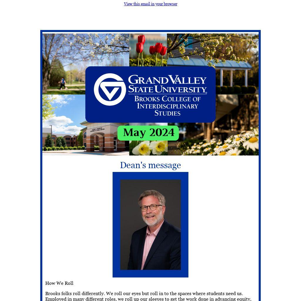 We bid adieu to a valued colleague this month, associate professor Brent Smith of the School of Interdisciplinary Studies. Brent has been a part of GVSU and Brooks College since 2010. His warmth is cherished by our Brooks College community, as he always made time for a chat or stroll, connecting with others on a personal level. At his retirement gathering, Brent delivered a moving and meaningful speech sharing his insights and journey. Explore this spotlight article on our Brooks College website to delve into his profound words.