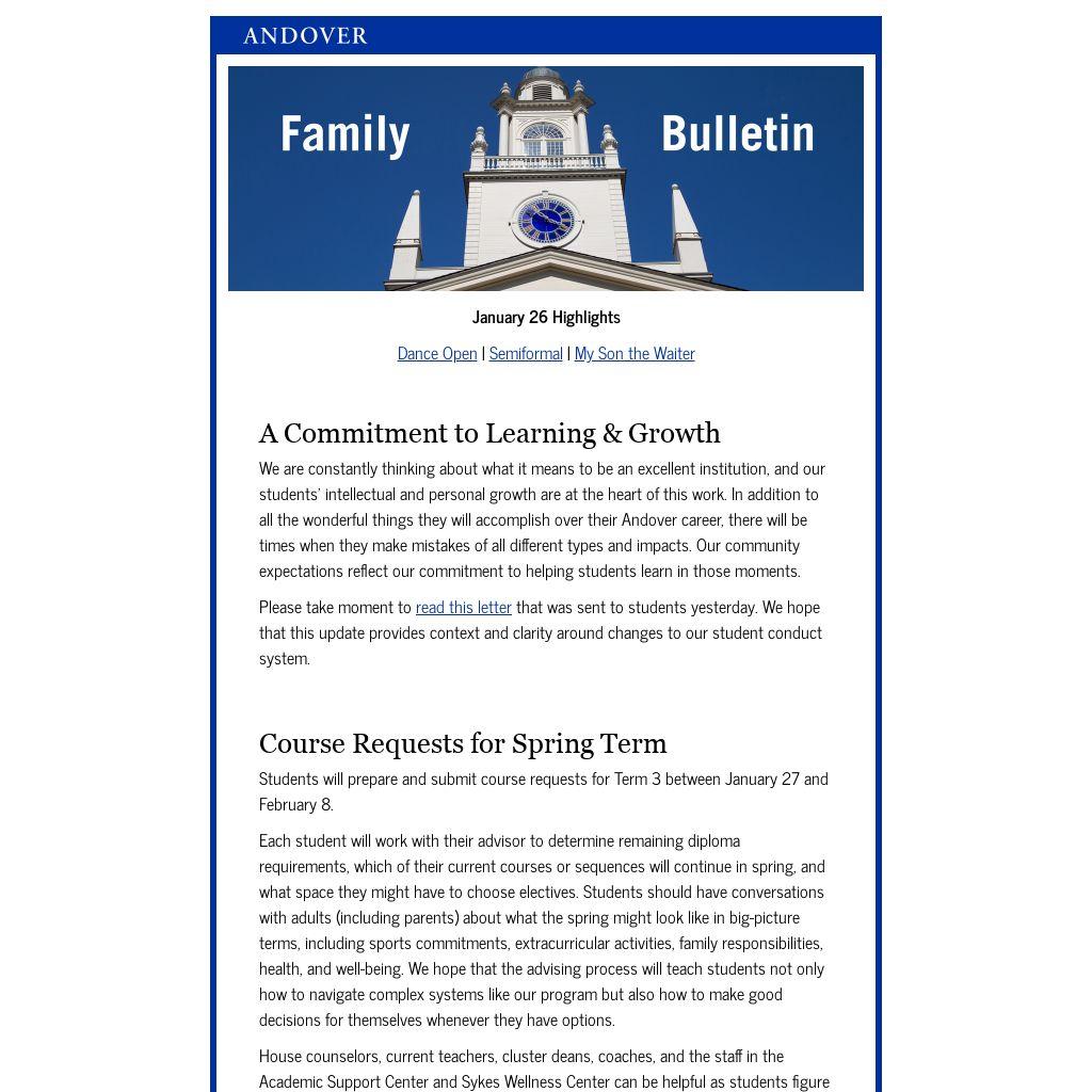 You received this message because you are a valued member of the Andover community. We are obligated to communicate with you, and require you to be on our email list while your student(s) attends Phillips Academy. For more information contact the Dean of Studies Office. |