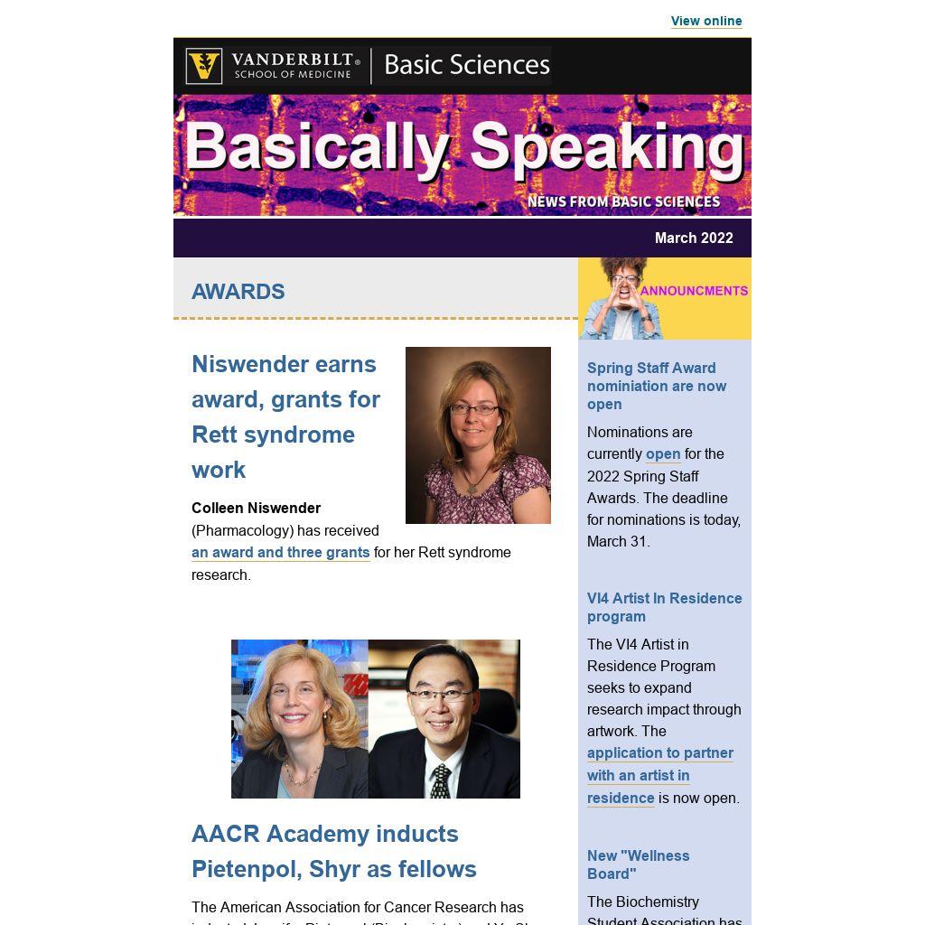 This newsletter recognizes the achievements and latest discoveries of students, postdocs, faculty, and staff associated with Basic Sciences departments, centers, and cores or who carry out basic biomedical research at Vanderbilt.